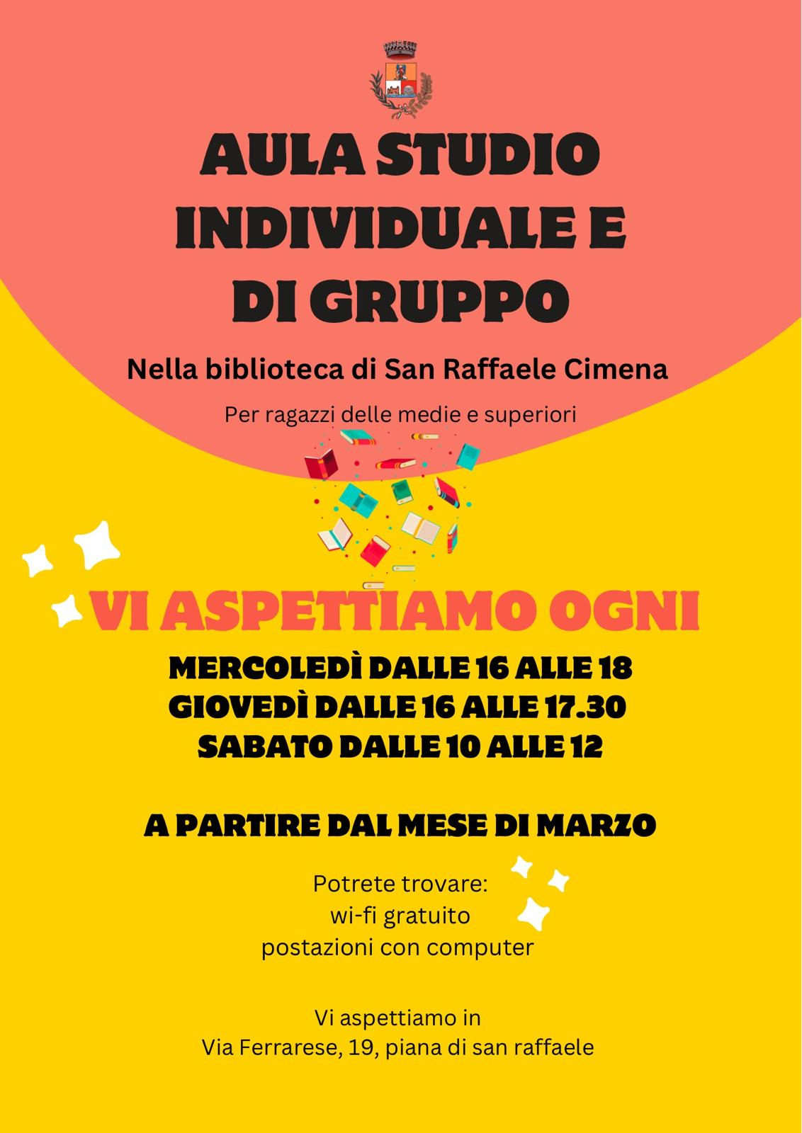 L'Amministrazione Comunale apre, presso la Biblioteca Comunale, un'aula studio per i ragazzi delle medie e superiori, nei giorni di Mercoledì dalle 16 alle 18, Giovedi dalle 16 alle 17,30 e Sabato dalle 10,00 alle 12,00.