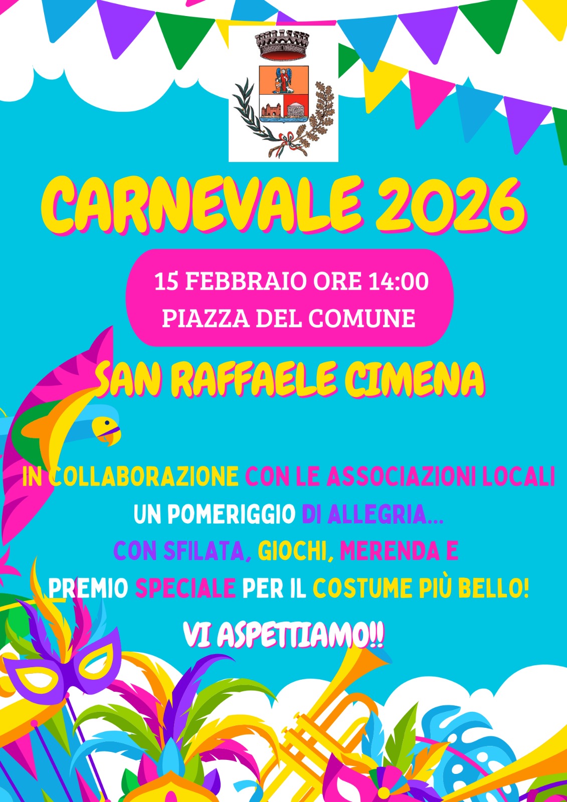 Domenica 15 febbraio la Pro Loco San Raffaele Cimena, con l'aiuto delle associazioni, organizzerà sfilata, giochi, intrattenimenti e merenda per i più piccoli.